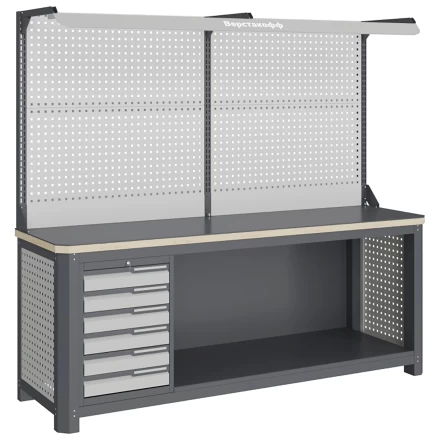 - экран (перфорированная панель) верстака выполнен с квадратной перфорацией 12х12 мм с шагом 38 мм для установки крючков, держателей и других аксессуаров;